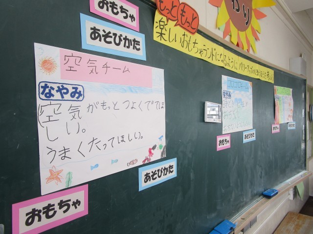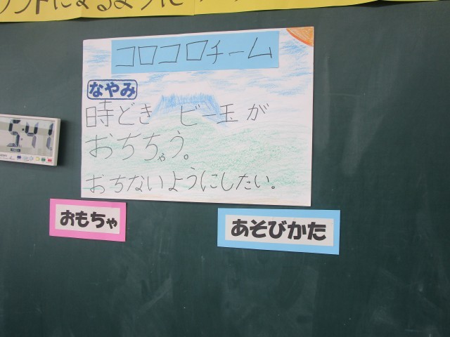 おもちゃをつくったうえで、それぞれのグループからのお悩みを聞き、みんなでそのお悩みを解決していこうと相談します。