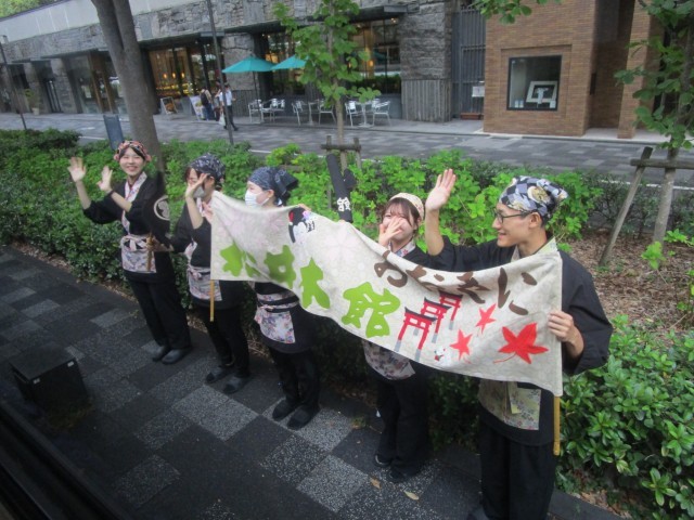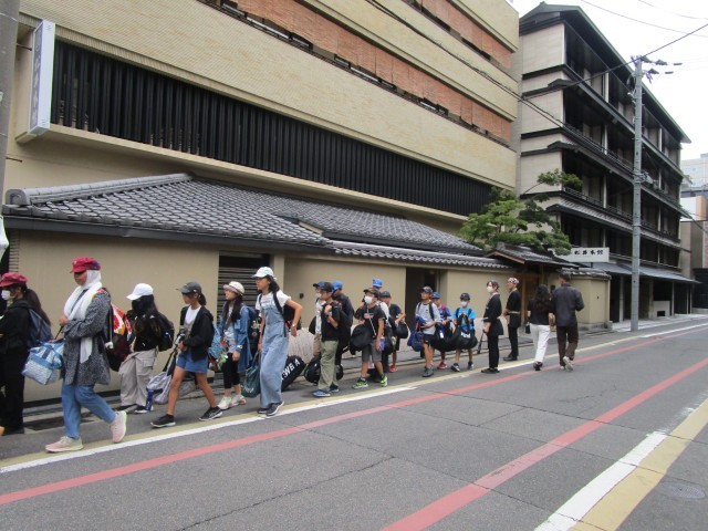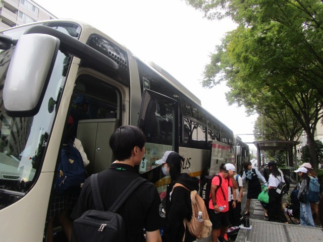 修学旅行は宿泊した松井本館を出発し、バスに乗って全クラス出発しました。バスの場所まで旅館の皆さんが安全を配慮して着いてきてくださり、お手製の横断幕で見送ってくださいました。