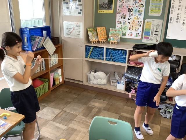 糸をこすると面白い音が聞こえたり、糸電話の糸を交差させるとたくさんの人数でも会話ができたり。