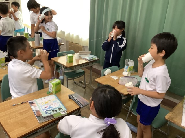 紙コップで糸電話を作り、トライアングルの音や友達の声を聞きました。