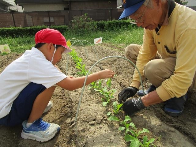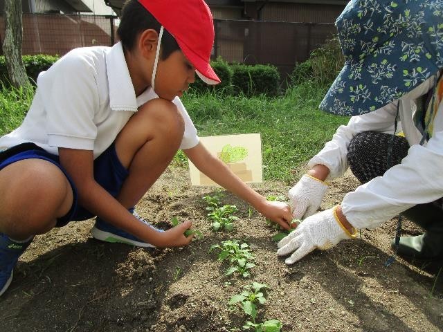 先月まいた、冬野菜の種が発芽しました。今日は、芽の間引きを教えていただきました。話をよく聞いて、慎重に間引きをしました。