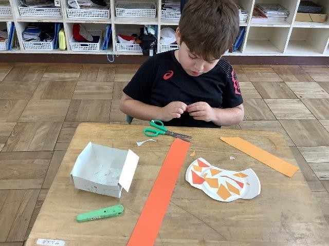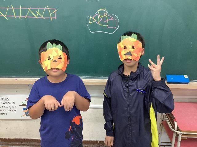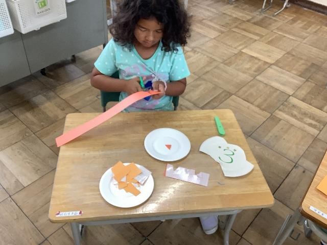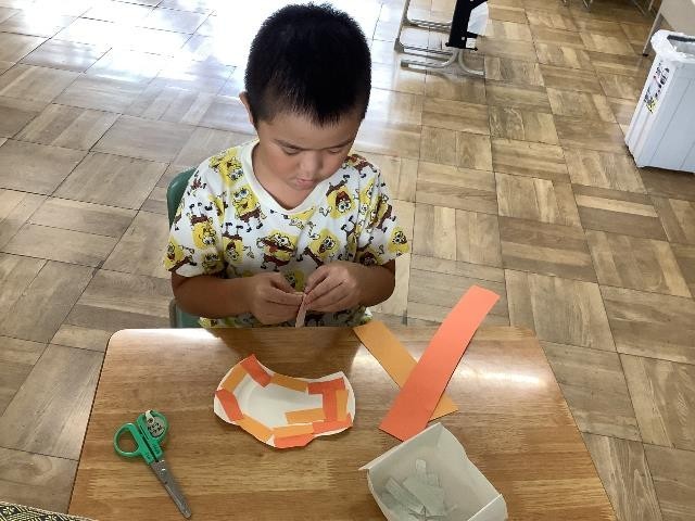 ハロウィンパーティーに向けて、かぼちゃの仮面を作りました。画用紙を三角形や四角形に切り、紙皿に貼り付けました。次週は、ハロウィンマントを作ります。