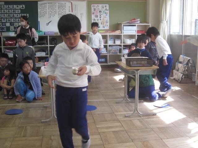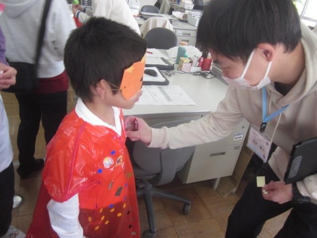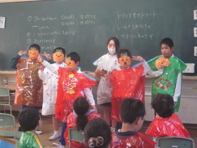 図工の時間に作ったマントとめがねを付けて、ハロウィンパーティーをしました。職員室の先生にシールをもらいに行ったり、ファッションショーやゲームをしたりして楽しい時間を過ごしました。