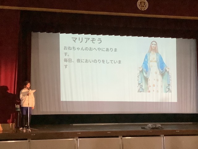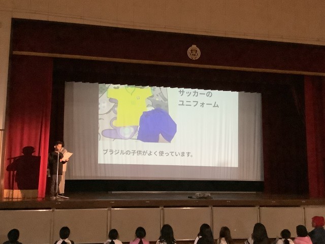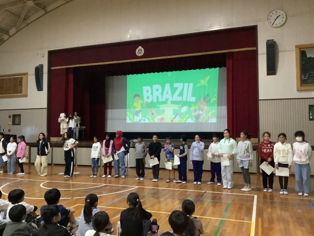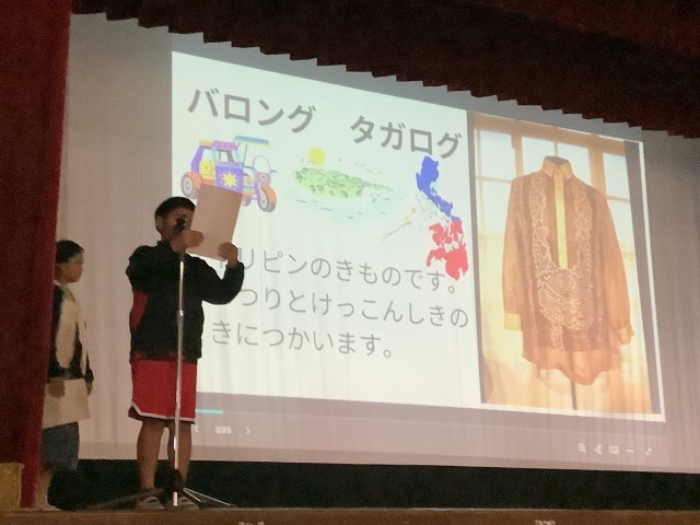 日本語適応教室「ひまわり教室」に通室している子たちが、学年の前で自分の国の衣食住を紹介しました。