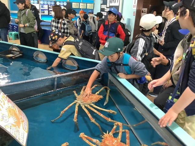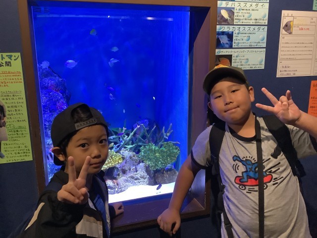 水族館では5年生のペアと一緒にきれいな魚を仲良く眺めたり、海の生き物を楽しく触ったりしました。