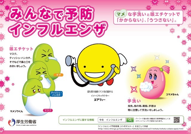 ちなみに、上記のポスターは愛知県の健康づくり応援キャラクターをモチーフにした、「手洗い」「咳エチケット」の啓発ポスターです。