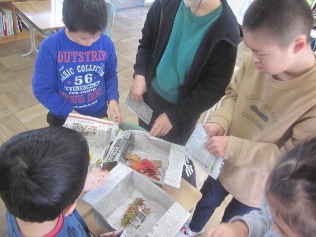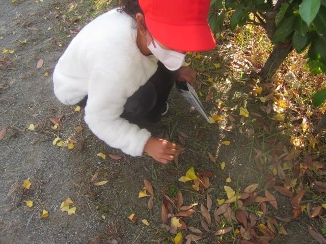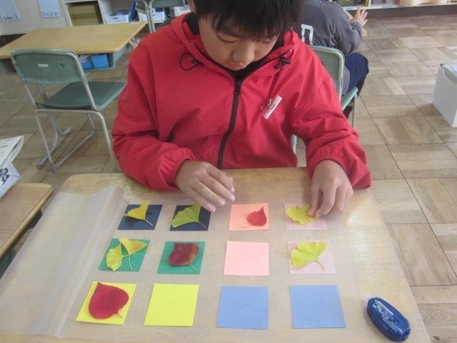 校庭に秋の落ち葉を拾いに行きました。赤や黄色に色付いた落ち葉をたくさん拾いました。教室に戻ってから、拾ってきた落ち葉を種類ごとに分けました。その落ち葉を使って、小物入れを作っています。出来上がった小物入れは、二本木小やさいやさんで販売する予定です。完成が楽しみです。