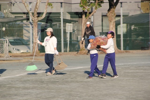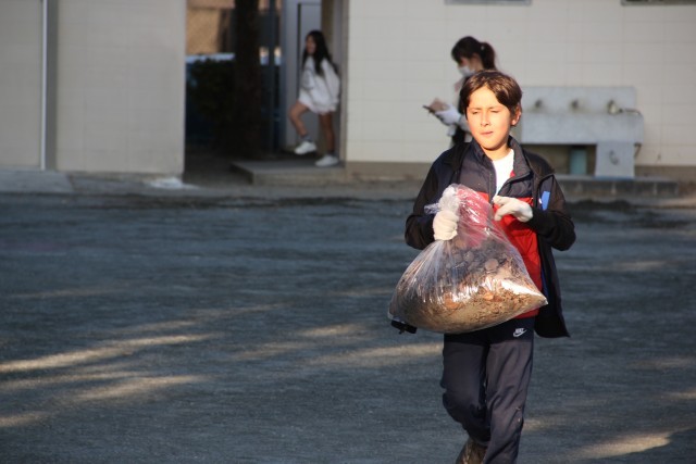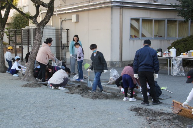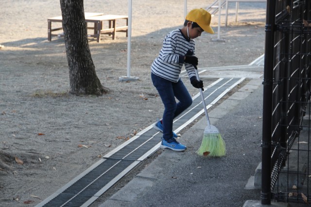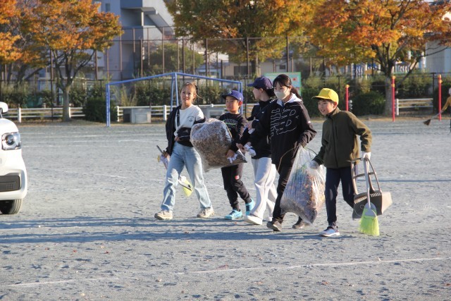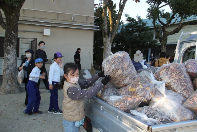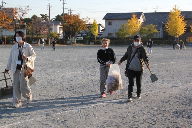 「そろそろ片づけをお願いします」の放送で、みんなが「がんばったぞー」の顔をしながら集合場所へ戻ってきました。たくさん落ち葉も集まりました。溝の土もすっかりきれいになりました。