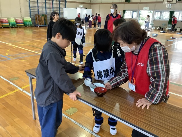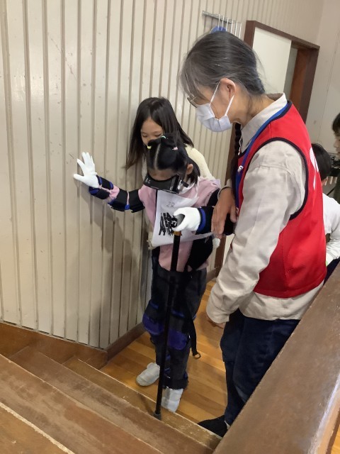 高齢者擬似体験指導サークル「たけうま」の講師の方々に来ていただき、高齢者体験を行いました。約3kgあるおもりと、杖を持って、箸を使ったり、階段を登ったりしました。また、ゴーグルをつけて、いつもみえる景色とゴーグルを付けた景色をみ比べました。生活することの大変さを身にもって体験することができました。