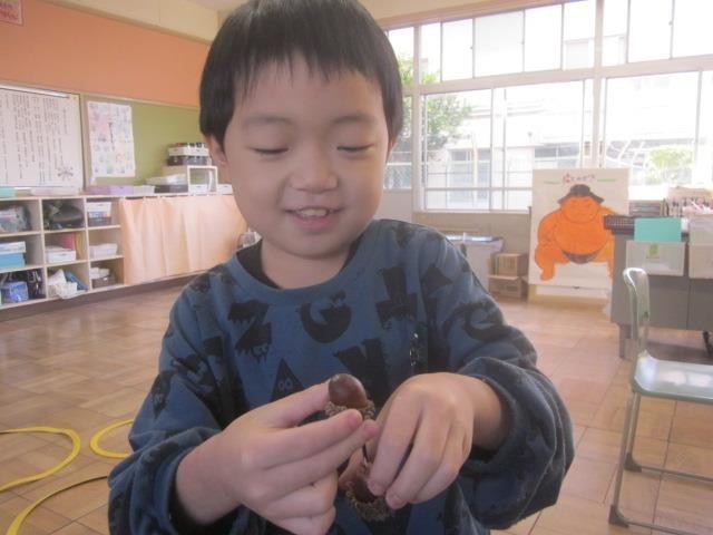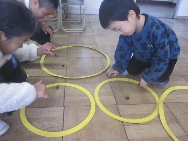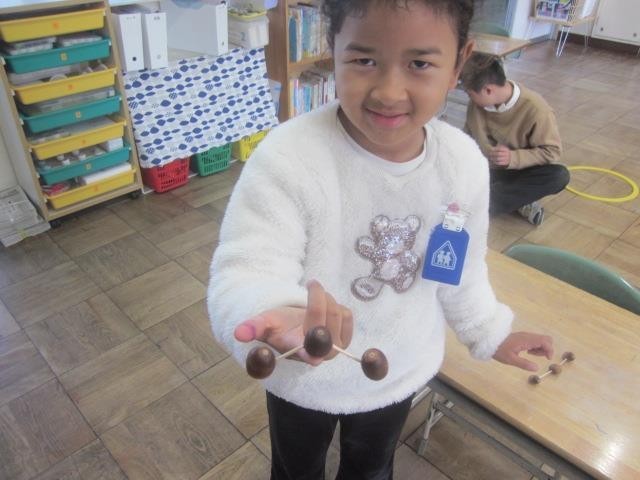 遠足で拾ったドングリを使って、「ドングリごま」や「やじろべえ」を作りました。作ったドングリごまをみんなで回して、楽しく遊びました。