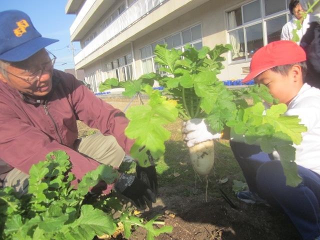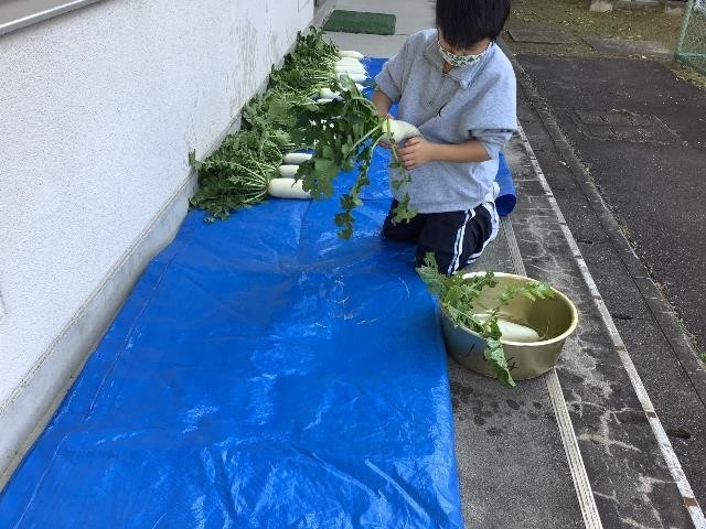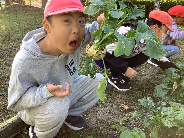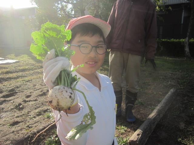 畑で育てた冬野菜を収穫しました。大きく育ったダイコンやカブがたくさん採れました。収穫した冬野菜は、明後日の「二本木小やさいやさん」で販売します。ぜひお越しください。