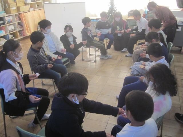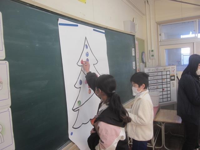 ダフニー先生、矢野先生と一緒に外国語を勉強しました。神経衰弱をしたり、クリスマスツリーに好きな色の飾りを貼ったりしました。