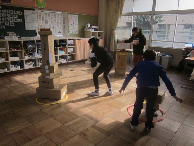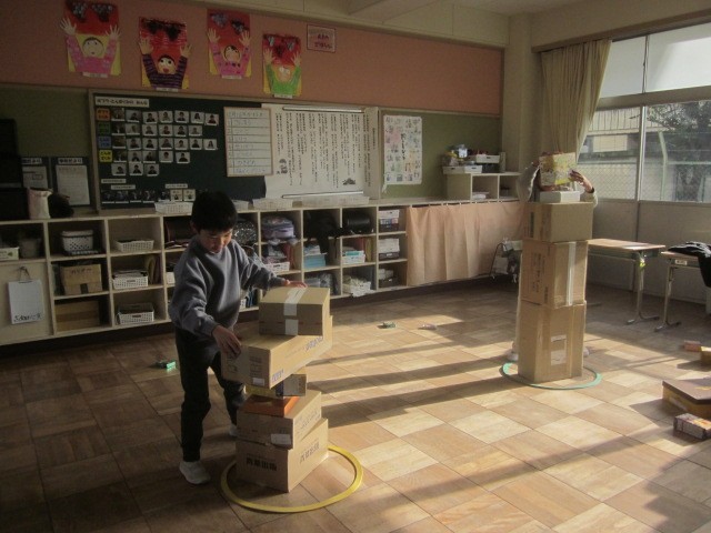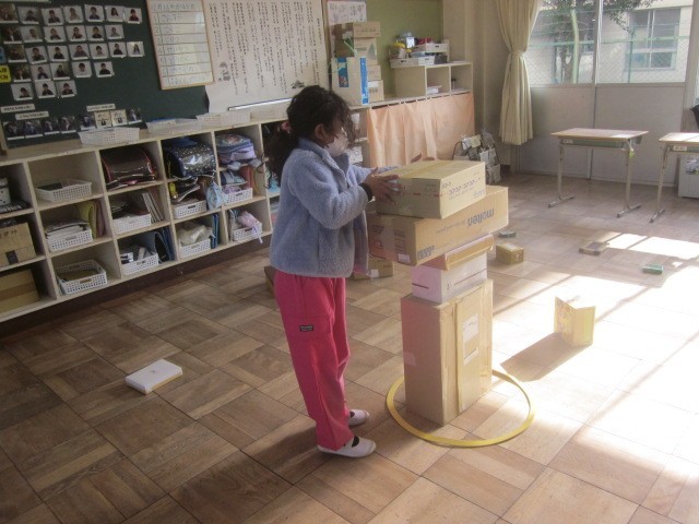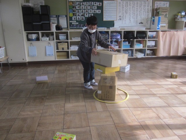 ポプラ・とんぼ組の自立活動では、いろいろな箱を工夫して積み上げるという学習を行っています。 今日のお題は、「どれだけ多く積めるかな」。箱の向きを変えてみたり、置く順番を変えてみたりとそれぞれ考えながら工夫して箱を積む姿が見られました。次はどんな風に積もうかな。