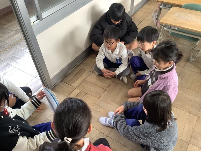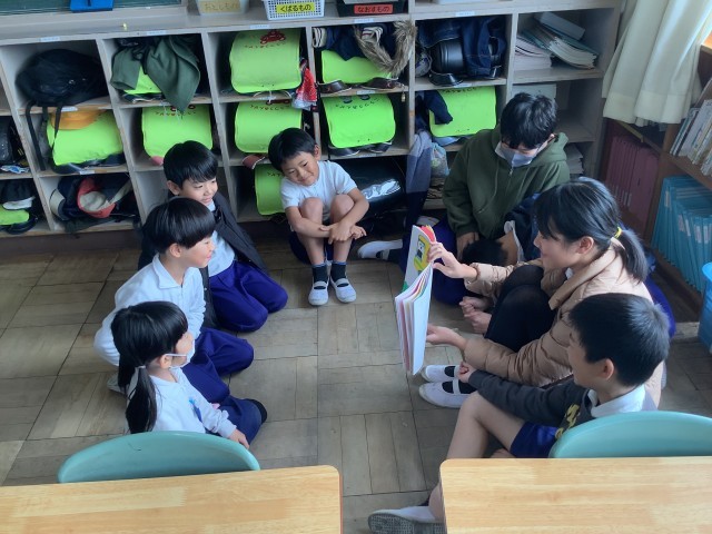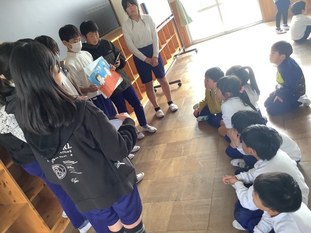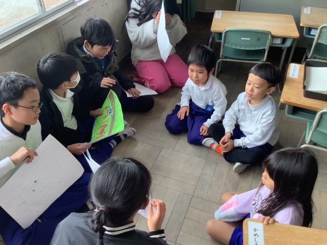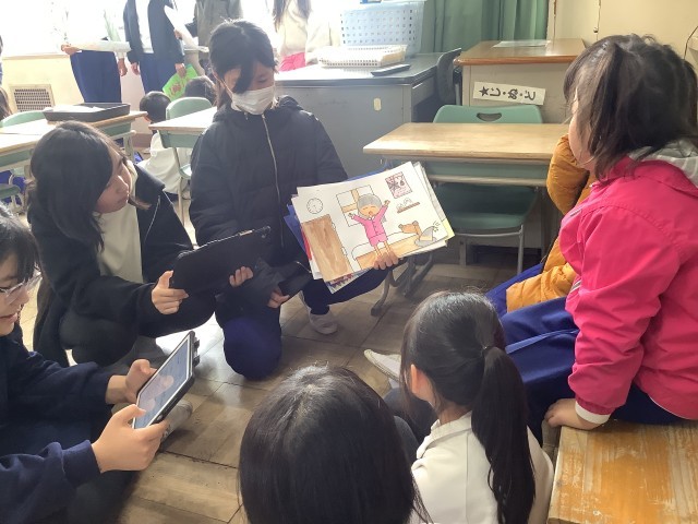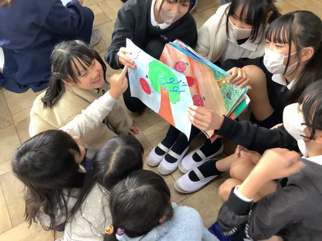 6年生が考えたオリジナルの紙芝居に、1年生は夢中になって聞いていました。