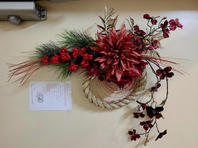 校長室の前には現在、多文化共生学校と称するにふさわしいように、しめ飾りをリースにしたものを掲げております。