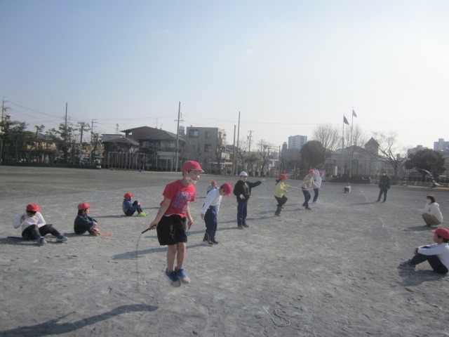 1月の体育では、なわとびを行っています。今日は、前跳び、後ろ跳び、かけあし跳び、あや跳びの中から自分が挑戦したい技を選び、それぞれ練習しました。最後には、練習の成果を見せ合う発表会を行いました。どの子も以前よりも上達している姿が見られ、うれしく思います。