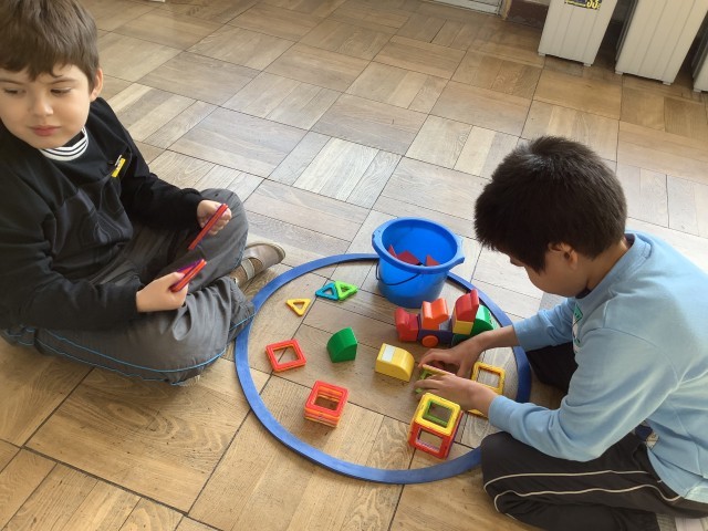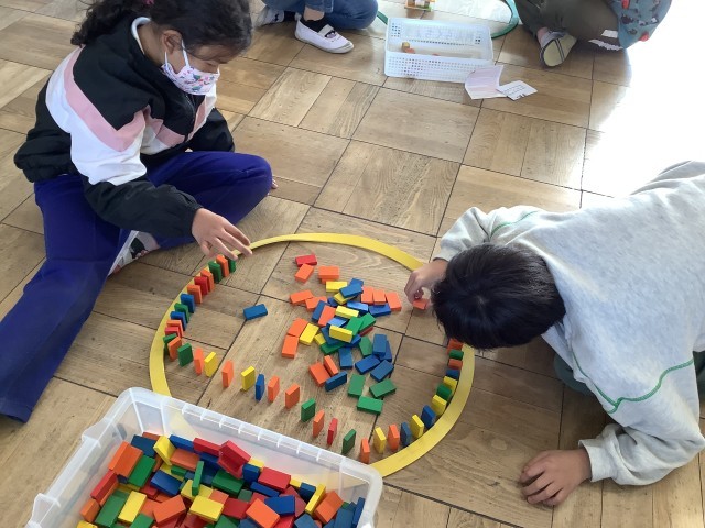 道徳「なかまにいれて」では、一緒に遊びたいときには何と言うのか、言われたら何と答えるのか考えました。その後、実践として一緒に遊ぶための練習をしました。