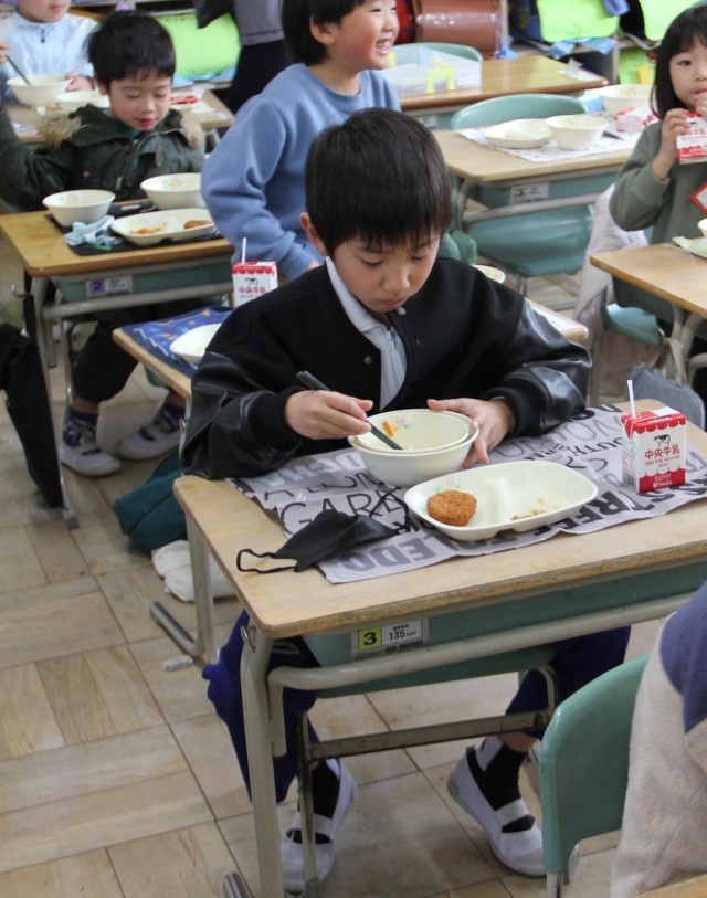 昨日の給食、1年生の様子を見に行きました。かぼちゃのコロッケやとりめしの具を元気よく食べていました。