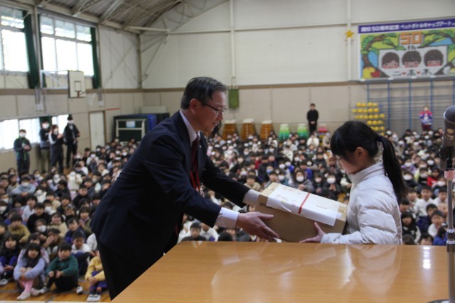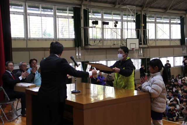 第12回全国小学校ラジオコンクール取組部門ルーキー賞の表彰式を行いました。かんぽ生命の岡崎支店の支店長さんや業務部長さん、業務部の担当の方、学校の近くの美園郵便局の局長さん(いつもラジオ体操の予備用カードをたくさんくださいます)が、表彰状や副賞、全校児童分の参加賞をもってきてくださいました。支店長さんのお話のなかで、「東海地区では1校だけ入賞ですよ」と教えてもらってびっくり。「ラジオ体操をすると全身の650ぐらいある筋肉のうち、400が動くんですよ」とも教えてもらい、さらにびっくり。「来年もがんばって応募してくれると、もしかするとルカリオが来てくれるかもしれないよ」と言われ、「わぁ」と。