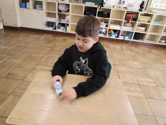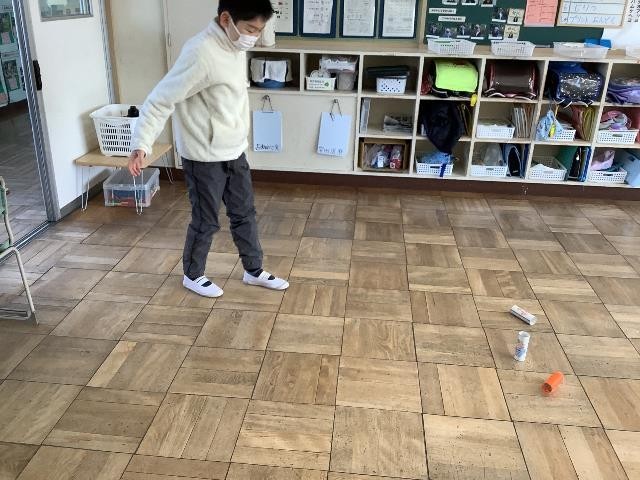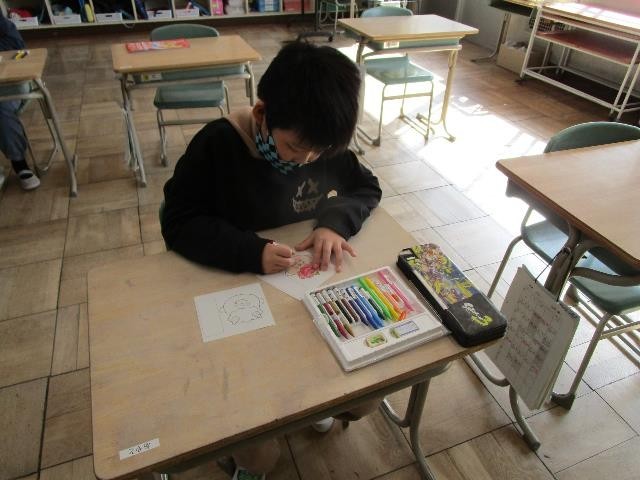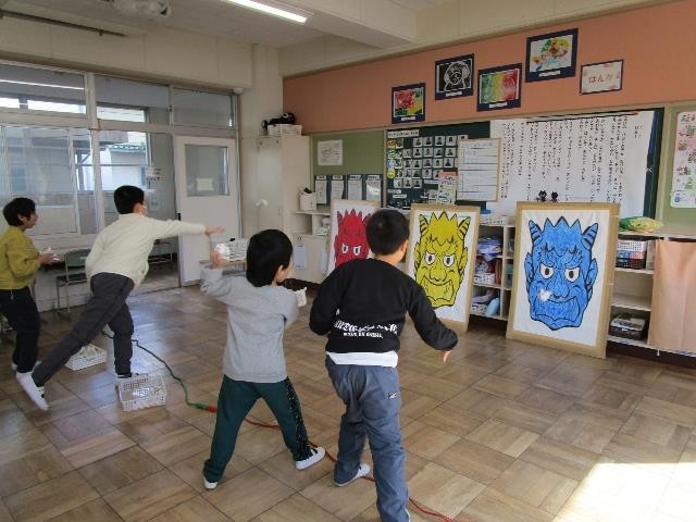 図工の授業でトイレットペーパーの芯を使って鬼の的と転がす棒を作って、「鬼退治」をしました。また大きな鬼の的に向かって手作りの豆を投げました。「鬼は外!!」の掛け声とともに、子どもたちは楽しそうに豆を投げ、元気いっぱい鬼退治をしました。