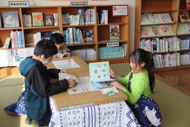 図書ボラさんも「こっちにならんでね」「何年生か言ってね」と声をかけてくれました。あっ、こたつだ!こたつに入ってまったり読書を楽しんでいる人もいましたよ。
