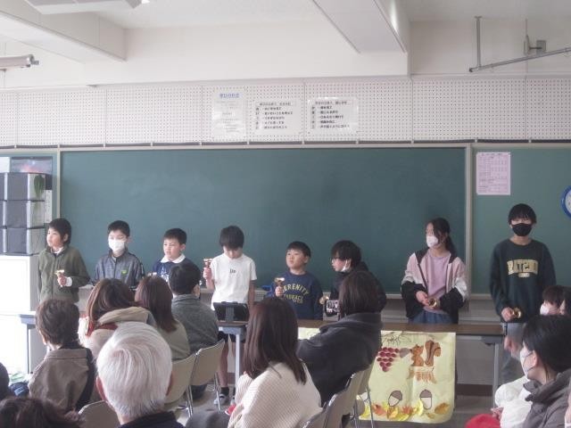 学習発表会を行いました。今年はハンドベルに初挑戦し、季節の曲を演奏しました。他にも夏野菜や冬野菜に関するクイズを発表しました。最後に、一年間野菜作りでお世話になった津田さんにお礼の手紙を渡しました。