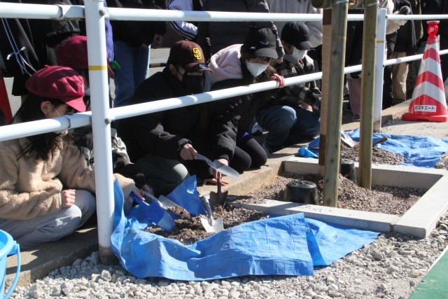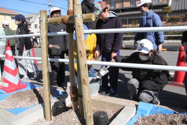 正門の桜の植樹をさせてもらいました。今回は3年生4年生5年生です。校長先生のお話の後、スコップ(移植ごて)1杯ずつ、木に「きれいに咲いてね」「大きくなってね」と、声をかけながら土を入れました。今回も工事の方が「子どもたちの心に残るように」と、日程を調整してくださって見守ってくれました。町内会さんも来て見守ってくれましたよ。