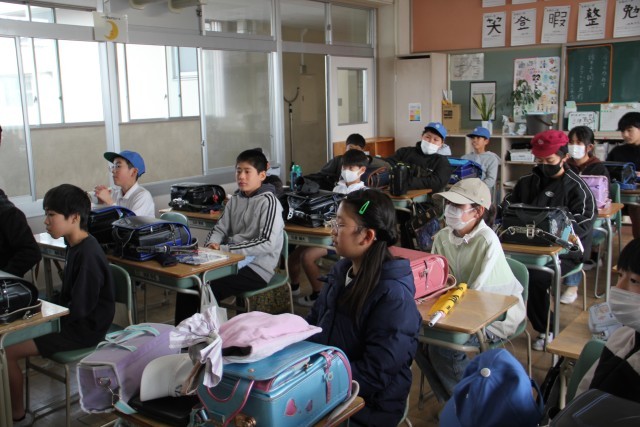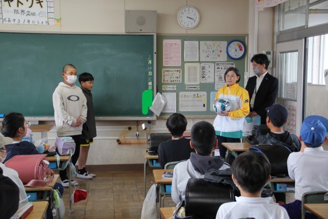 保険会社の方が「サッカーをみんなで楽しんでくださいね」「サッカーを通して元気な体や仲よくする心を育ててくださいね」と、サッカーボールをプレゼントしてくださいました。6年生の体育委員に代表で受け取ってもらいました。