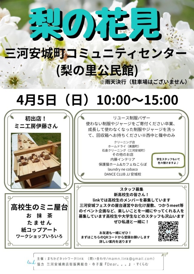 お化けの学校・二本木⭐イルミネーションを共に企画してくれたNPO法人linkより、「梨の花見」のご案内(4月5日)