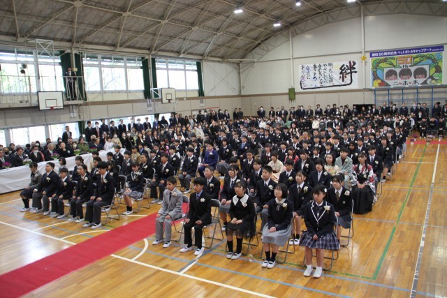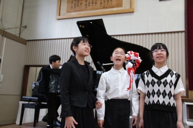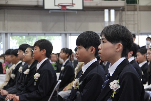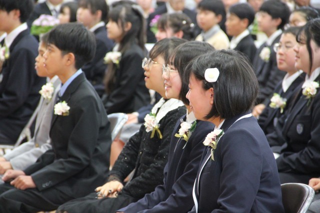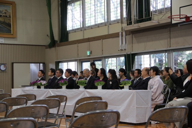 校長先生の式辞やPTA会長さんの祝辞です。真剣に聞いて、ときどきびっくりして、ちょっと笑顔で。5年生3人が校長先生のお話に気合に入った歌を添えました。