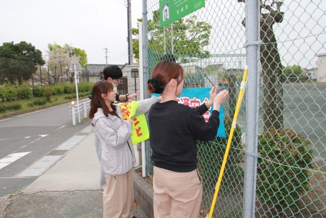 たくさんのプリントを順番に並べたり、花をつけた名簿を用意したり。交通安全ののぼりや横断幕も新しいものにしました。児童会のスローガン「目指せ!スーパー小学生!」も新しくしましたよ。