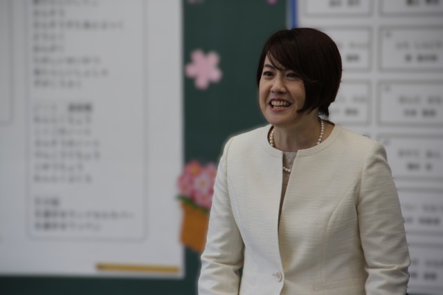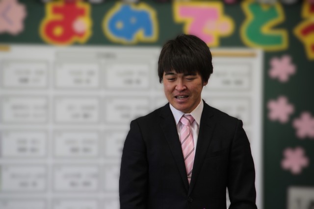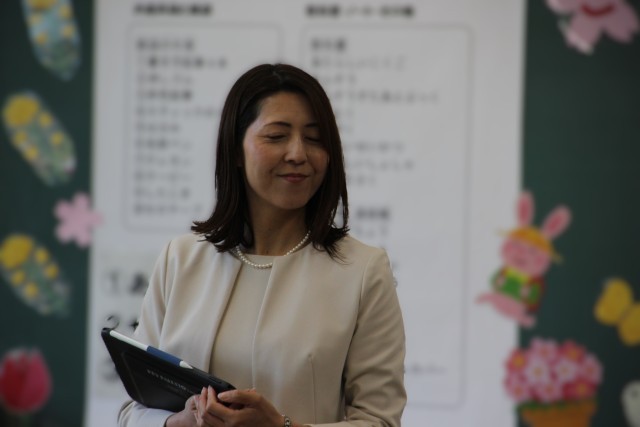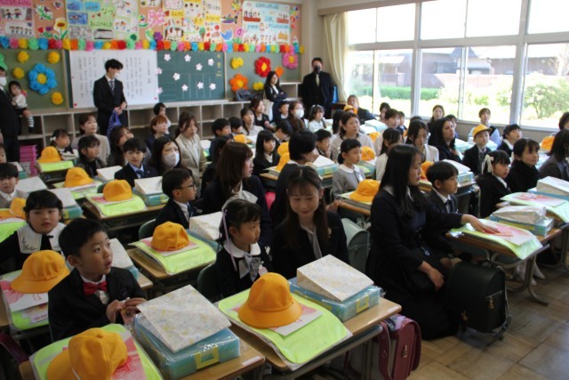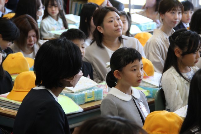 背中をぴーんとのばし、先生のお話を真剣に聞いていました。「みなさんが入学するお祝いの日だから、今日はさくらいろのネクタイにしました。」ひとりひとり名前を呼ばれて、とてもすてきな返事をしているクラスもありましたよ。