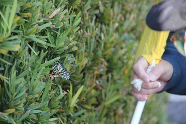 登校中、登下校見守りボランティアさんと一緒に、じーっと植え込みを見ている人がいました。……あっアゲハチョウ!「帰りまで、いるかなぁ」どうだったかなぁ。