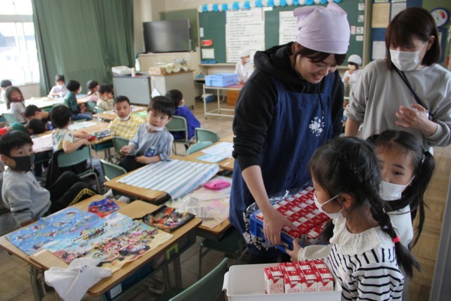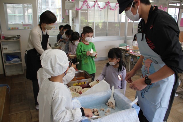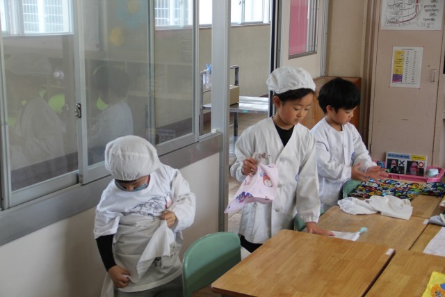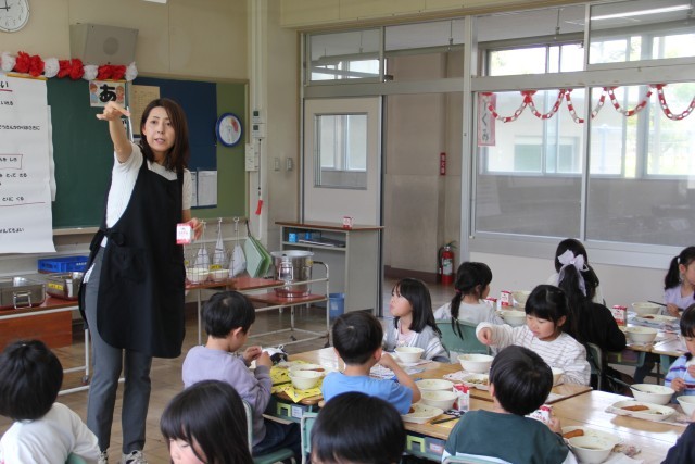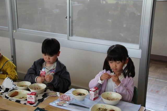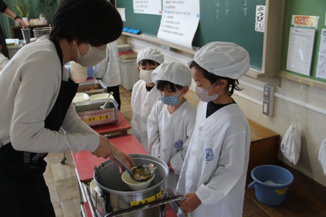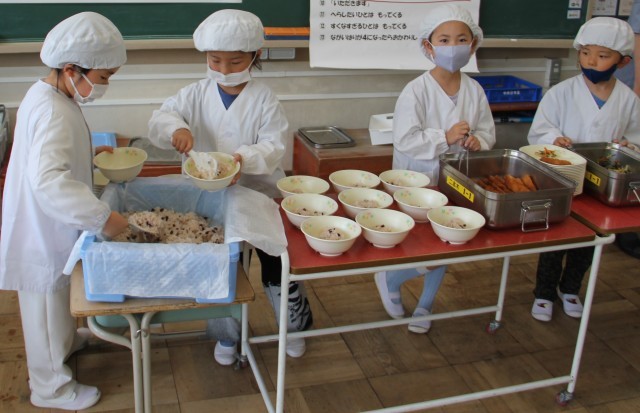 今日から給食です。1年生は給食当番のやり方を教えてもらいながら、がんばって配ぜんしました。「このくらいずついれてね」「おつゆは食缶の上でこうやってよそえば、こぼさなくてすむからね」慎重にやってみました。