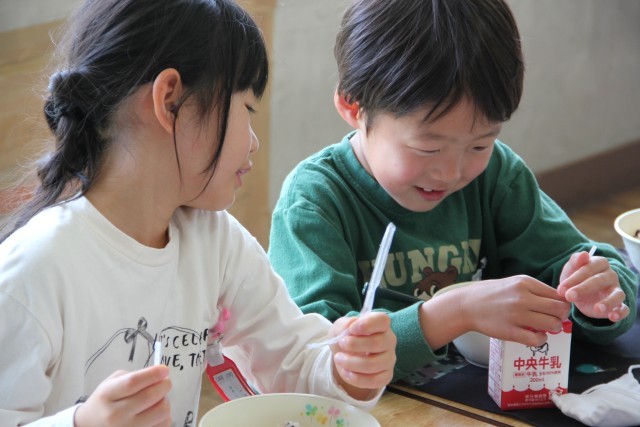 牛乳を飲む前に、先生が片付けのときのごみ捨ての極意を教えてくれました。やってみたけど……難しい!「あ、できた」「これでいい?」