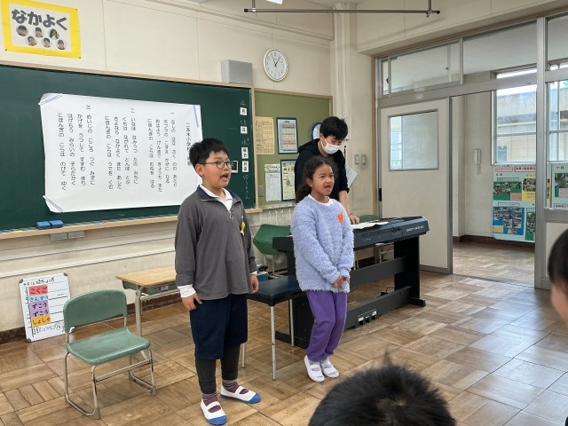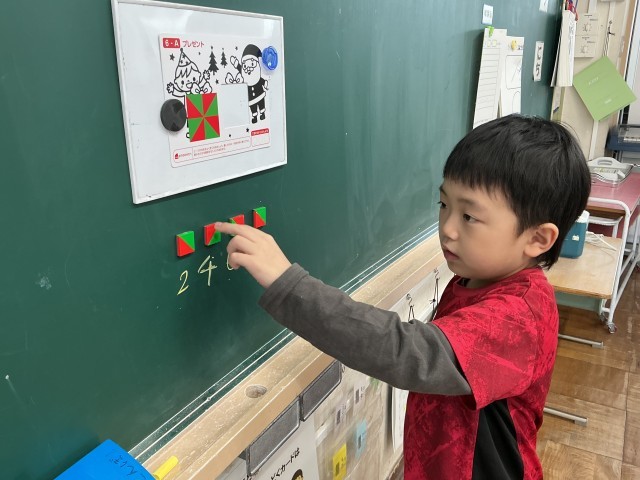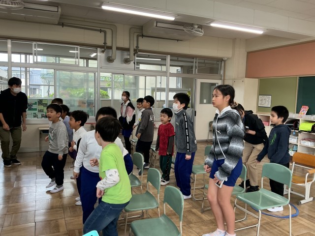 今週から早速、教科の授業が始まりました。国語と算数では、クラスの垣根を越えてチーム別で学習をしています。正方形を作るために必要な三角形の板の数を2つずつ数えるとよいと発表する姿も見られました。音楽では、1年生に向けて校歌を歌ったり、「ぞうさん」の歌の伸ばす音に合わせて動いたり、止まったりと楽しく活動しました。
