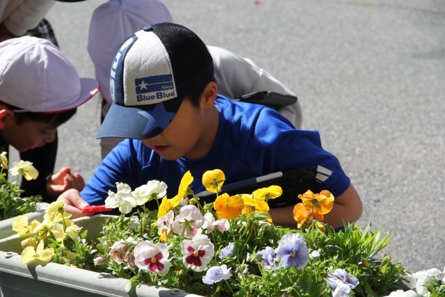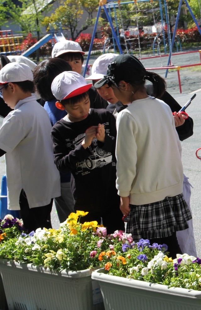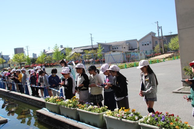 3年生がタブレットとルーペ(虫めがね)をもって外へ。3年生から始まった理科の授業で「春みつけ」にやってきました。「あっ魚が泳いでる!」「この花、うちにも咲いてるなぁ」ルーペを使ってじっくり観察していました。