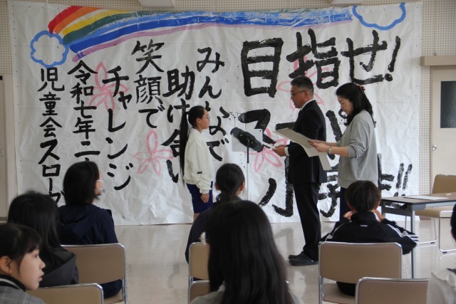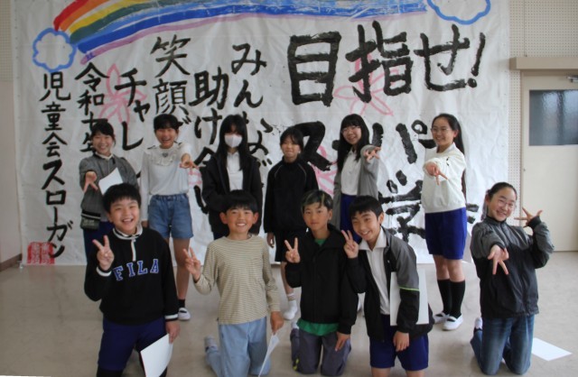 全校朝会を行いました。新しく前期委員長になったみなさん、学級委員になったみなさん、昨年度末に選挙で児童会執行部に選出されたみなさんの任命を校長先生にしていただきました。校長先生は「学校のため、みんなのためにがんばろうと思って立候補したり選ばれたりしたみなさんに任命状を渡しました。『がんばろう』という気持ちがとてもスーパーな姿だと思います」とお話されました。任命後、みんなで写真撮影……スーパーなやる気に満ちた笑顔です。