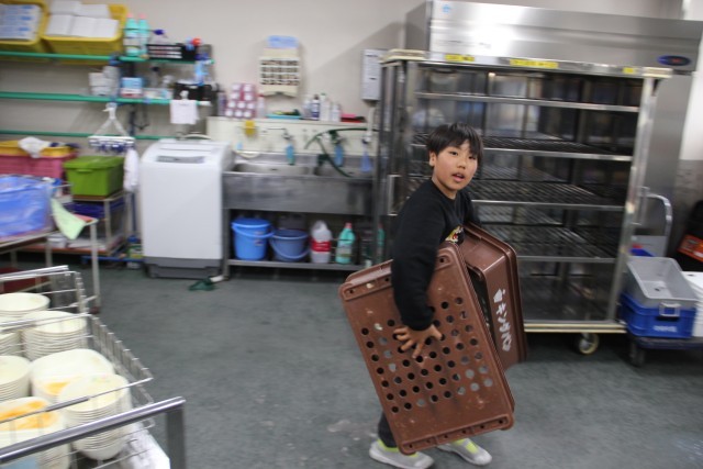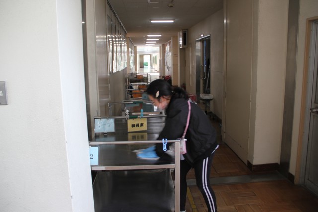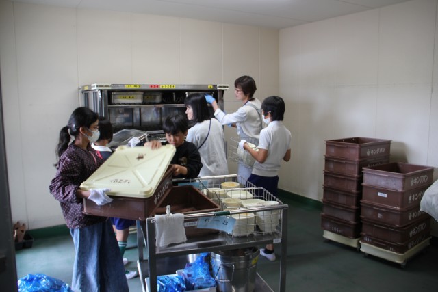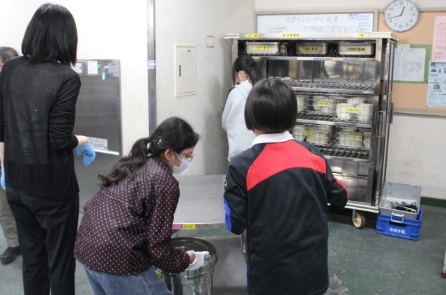 給食の後の片付けを給食委員会が行っています。毎日毎日のことなので、大変です。それぞれの教室でしっかり片付けてくれているかどうかも確認します。調理場の自動車が来るまでに行わなくてはならないし、今日は下校時間も迫っているし……、でも仕事はきっちり丁寧に。がんばっています。