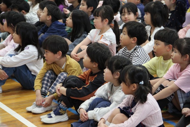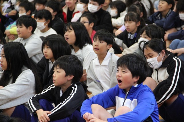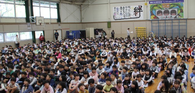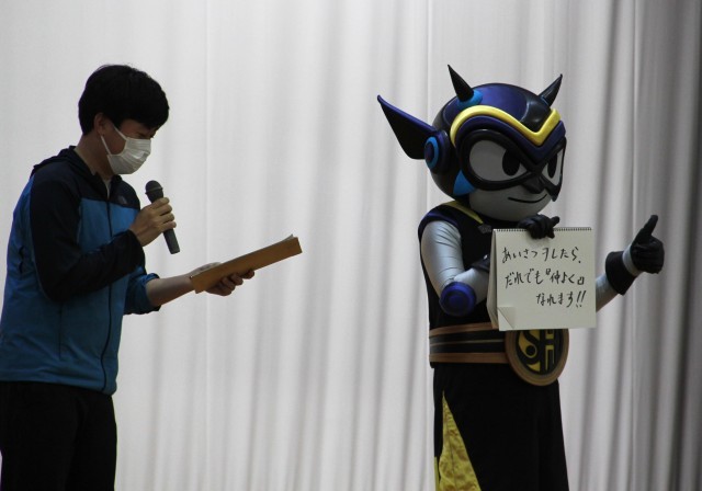実は、今年度、全校児童みんなが体育館に入ったのは今日が初めて。そこへ「タツヲ」がやってきました。みんな、何が始まるんだろうなぁと、わくわくしながら見ていると、児童会役員さんが「タツヲ」を紹介してくれて、「あいさつについて教えに来てくれたんだよ」と、お話してくれました。