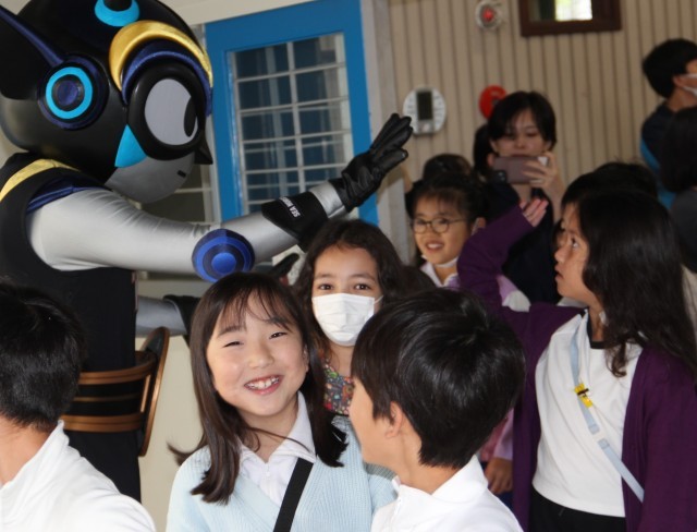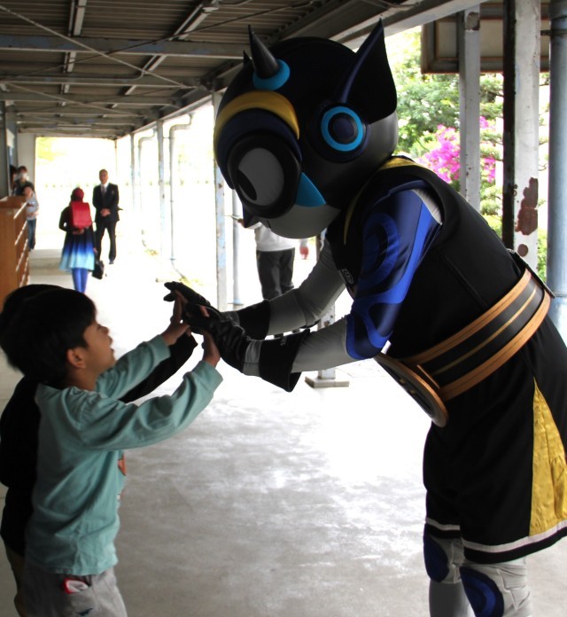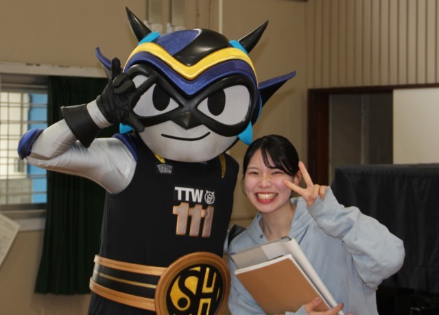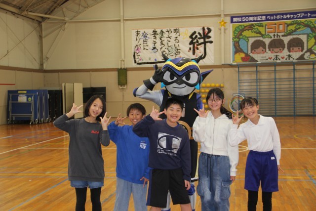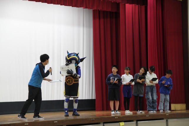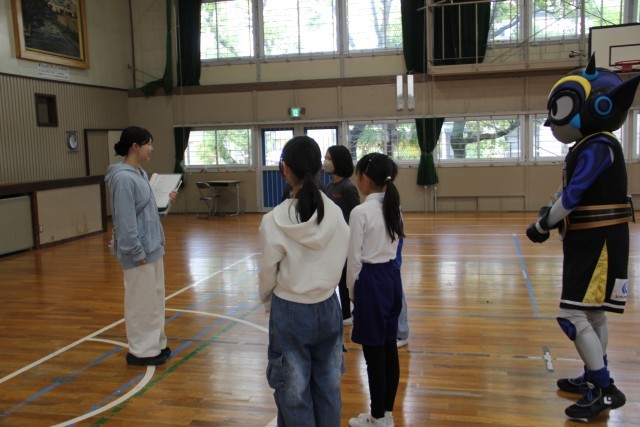 プロバスケットボールチーム「シーホース三河」の所属タレント「タツヲ」が、二本木小学校に来てくれました。