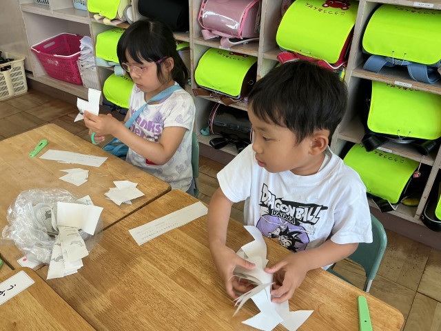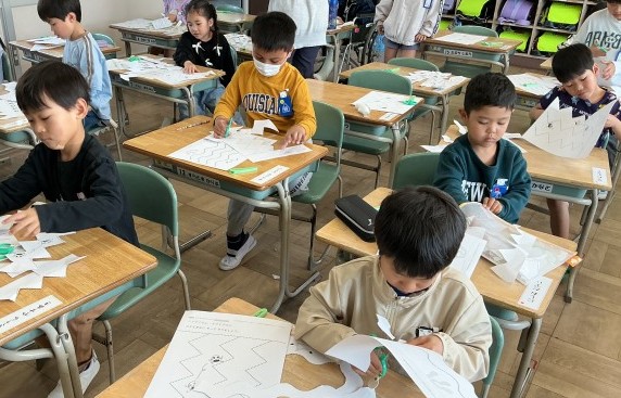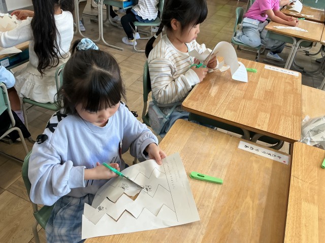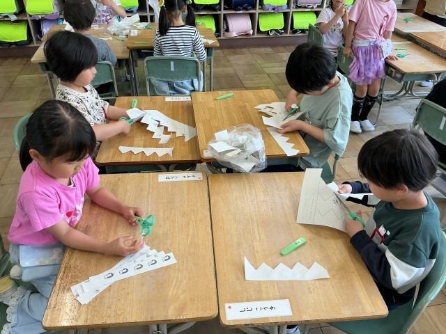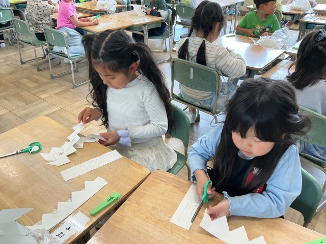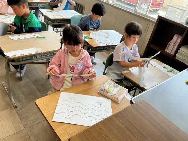これから、学習のいろんな場面で使う「はさみ」。まっすぐ、ジグザグ、なみなみ、いろんな切り方の練習をして、これからどんな作品を作るんだろうと想像が広がりましたね。どのクラスも怪我なく、安全に練習することができて素敵でした。