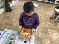 絵の具を付けたビー玉を転がして、つくしの顔に模様を付けました。一個のつくしには、かわいい顔を描きました。もう一個のつくしには、未来に向かって伸ばしたい力をそれぞれ書きました。
