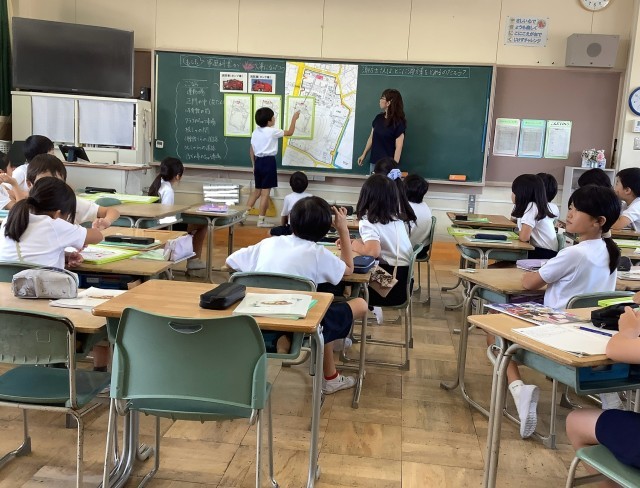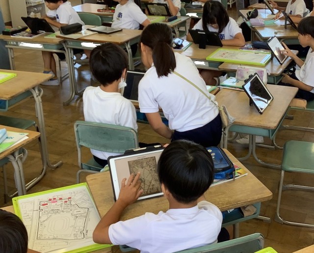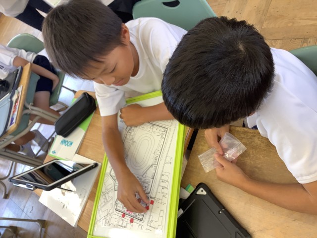 もしも、家庭科室が火事になったら、消防士は消防車を学校のどこにとめて火を消すのだろうか。学校周りの地図をホワイトボードにはり、マグネットを消防車に見立てて考えました。「運動場にとめたら遠くないかな」「タンクの水がなくなったらどうするの」子どもたちは、消火栓の位置をタブレットの資料で調べながら、どこにとめるのがよいのか、力いっぱい考えました。