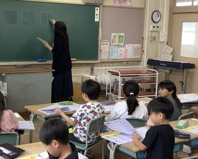 先生のお手本を見て、空書きした後、ドリルに練習をしました。