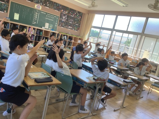 2組は理科「太陽とかげ」の学習の様子です。先生の問いにすぐに反応して元気に手を挙げていました。ひとり一人が自分の意見をもち、予想を立てながら話を聞いているので