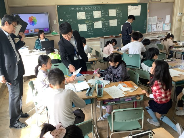 「3のかたまりを数えたらどうかな」「正方形と長方形に分けられるよ」グループで学び合いながらどのように計算するのかを考えました。