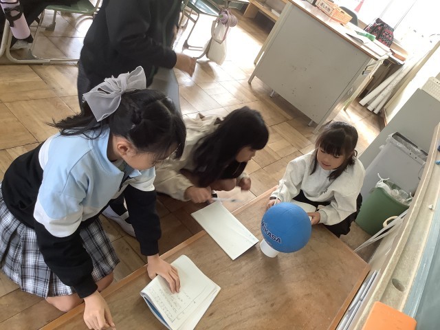 1組は「円と球」の学習です。模型を使って、切り口の形や円の直径の長さなどを調べました。