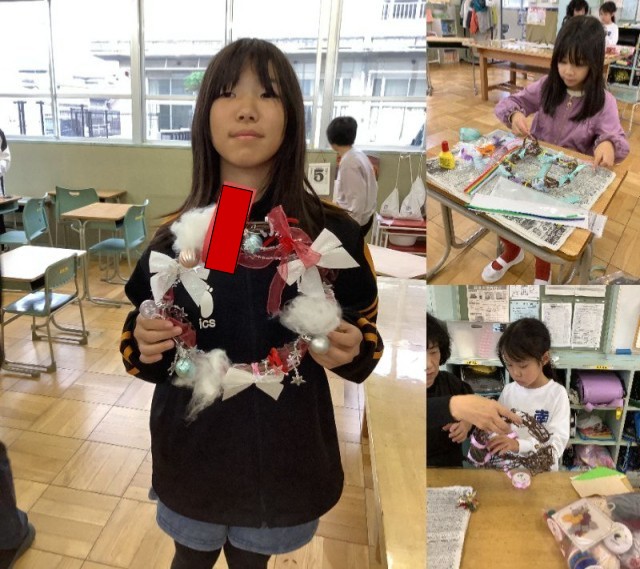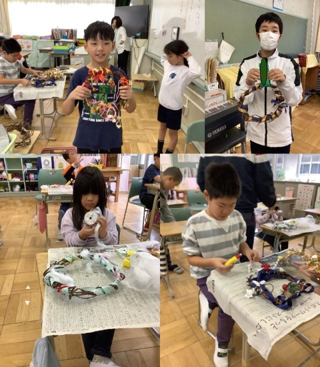 子どもたちが育てたサツマイモのつるを使って、クリスマスリースを作りました。