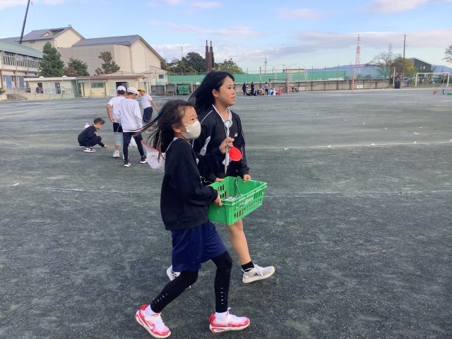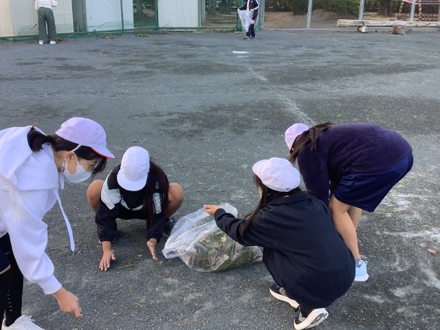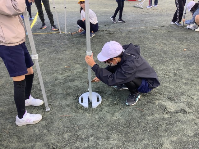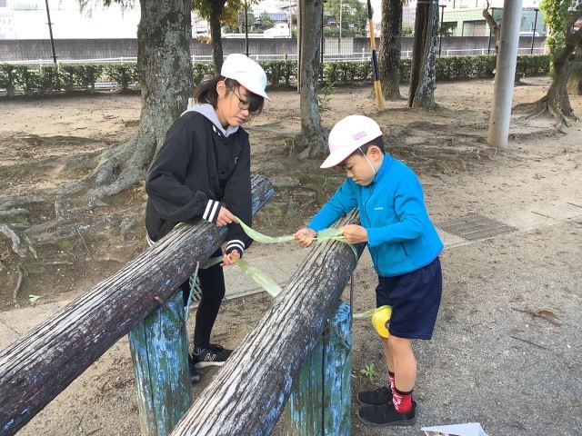 テントを建てたり、遊具にタフロープを巻いて使わないように掲示したり、運動場の落ち葉を集めたり…